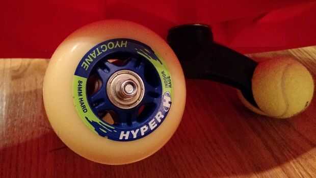 También puede considerar el tenis bola mod ve en la foto. Las ruedas delanteras del bebé no son realmente las ruedas, no gira. Están realmente ahí para atraparte si se activa demasiado agudamente inclinarse fuera de balance. Pero las ruedas delanteras del bebé también marca y arañar el suelo. Así que los quité y había reemplazado con la pelota de tenis.