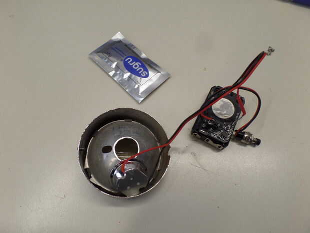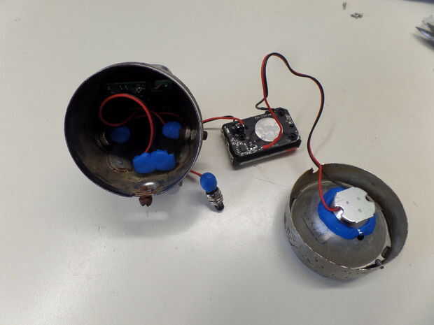Como la luz estaba trabajando ahora, otra vez era hora de sacar el sugru. La usé para fijar el reflector nuevo en clase de tapa/interior antiguo.