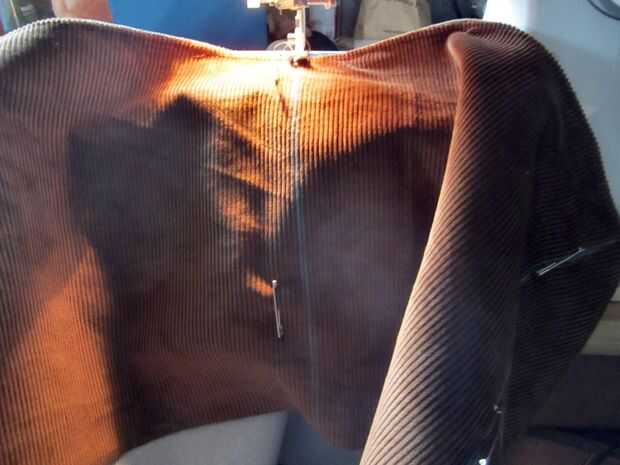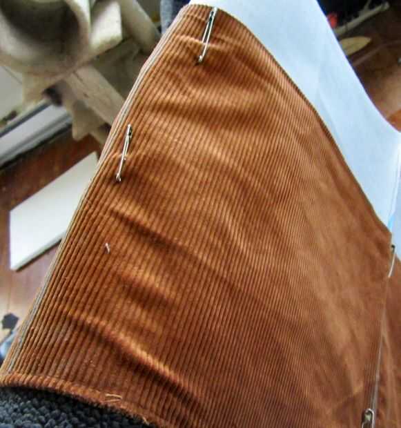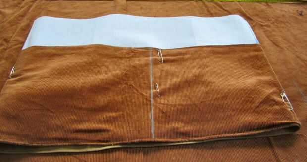 Uso de las marcas de tiza que hiciste en el paso 5, prender a lo largo de las líneas de tiza para que las clavijas de capturan dos capas de tela el exterior y el revestimiento (no todos cuatro capas). Coser las esquinas de las paredes a lo largo de las marcas de tiza. Estas costuras forman a las guías en las que se deslizarán las paredes de cartón.