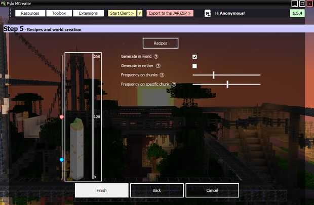 Haga clic en el botón de generación del mundo en la parte superior del editor de planos de fabricación y se obtiene otro menú agradable. Las partes de ese menú se describen en el cuadro, pues seguir adelante y editar los límites de la parte superior de la generación e inferior y elige tu frecuencia y cosas