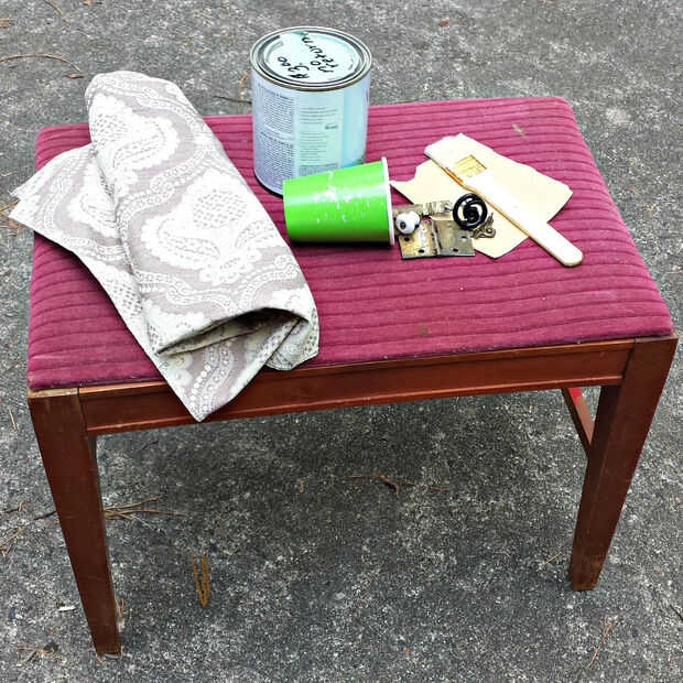 Tal vez, este escritorio fue utilizado por el varón cabeza de familia para pagar las facturas, pero el escritorio tiene un aspecto delicado, y creo que le gustaría pertenecer a otra mujer. Cavé hasta la parte posterior de una de mis áreas de almacenamiento de información para encontrar el taburete perfecto. Es rectangular, tiene las piernas largas como las patas de la mesa y es un patito feo gritando que quiere ser bella otra vez!