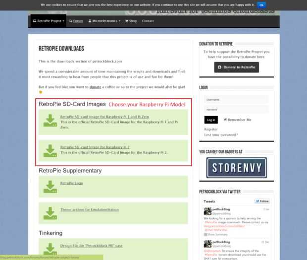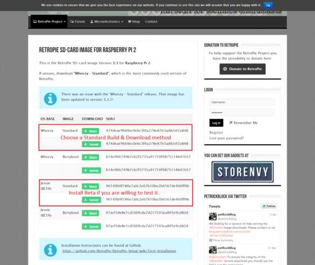 En primer lugar, vamos a necesitar El RetroPie sistema operativo desde el sitio del proyecto de RetroPie. Usted puede descargar esto mediante descarga directa o a través de su torrente (prefiero el torrent ya que es mucho más rápido). Asegúrese de elegir qué modelo de frambuesa Pi tienes y entonces el método de descarga (estándar de torrent).