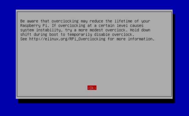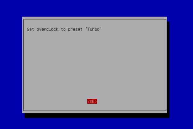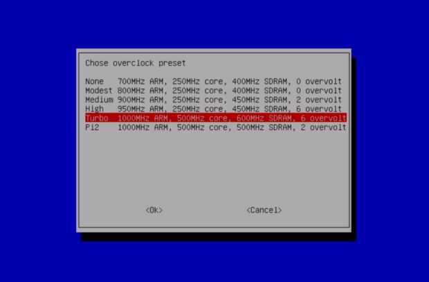 - Entonces, vamos a overclockear nuestro Pi (aquí es donde vienen los disipadores térmicos y ventiladores). Desplácese hacia abajo para Overclock. Entrar en overclock y luego seleccione Pi2. No seleccione Turbo. Congelará tu Pi . De lo contrario, se congele su Pi y vas a tener que empezar de nuevo.