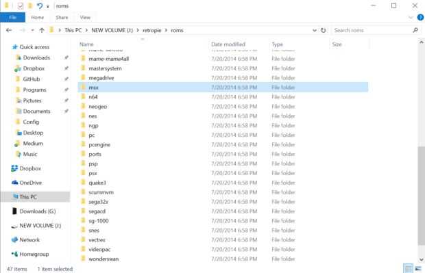 - Ahora es el momento para poner todas las ROMs en el pendrive. Dirígete a la unidad flash y vaya al directorio retropie > roms > y arrastrar las roms en las carpetas designadas. Por ejemplo, si tienes un ROM de SNES, colóquelo en la carpeta snes (archivos zip también son aceptables). ROMs de PlayStation 1 ir a la carpeta PSX.