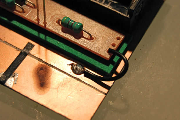 Tome el cable negro sobra y soldadura entre el orificio de "GND" en la luz del jardín de PCB y el carril de tierra en el panel solar.
