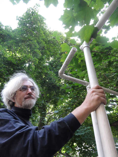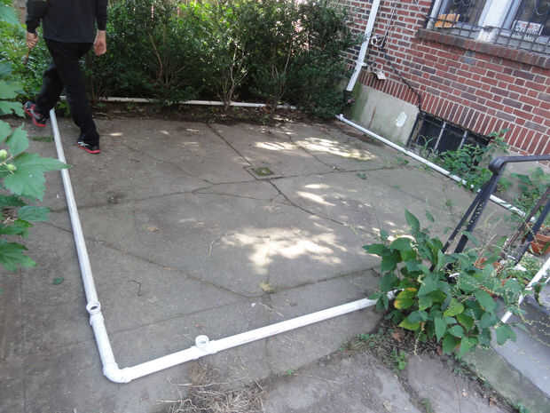 Las siguientes tres fotos están dedicadas a la creación de la base. Una imagen muestra cómo los conectores en forma de T se unen a la base. Las secciones de 4 esquinas están formadas por un codo de 90 grados con los pedazos de un pie en cada extremo. La base está montada por prensado de las secciones de esquina en los conectores "T". (Nota: el extremo abierto de cada "T" debe enfrentar directamente hacia arriba para que va a recibir las columnas.)
