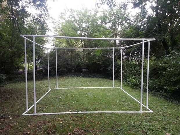 Para decorar: lo que hice una vez para la pared cubierta de sábanas y coser las correas en la parte superior para la que podrían ser atada sobre los rieles de la cabeza. La última vez que lo construyó, compré cortinas pestaña barato, 12 paneles. Las fichas pueden caber sobre el PVC antes de la "T" s son prensado en su lugar. Para el techo schach, puede poner postes de bambú o tubos más delgados a través de la vegetación superior y paso encima de ellos. Si los postes no son lo suficientemente largos, puede apoyarlas diagonalmente a través de las esquinas. La persona que primero construyó esta estructura había estirada a la tela en la parte superior y había anudada a los carriles principales. Vegetación puede añadirse a ello.