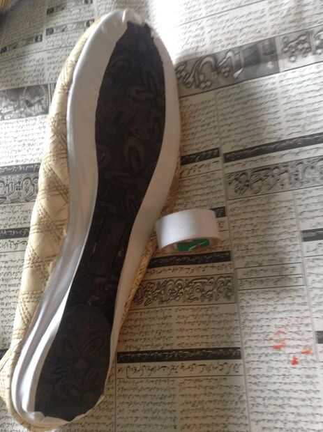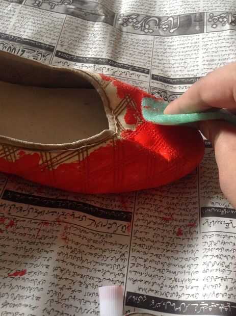 Tomar el cepillo de la espuma y sumergirla en la pintura y empezar a grabar en los zapatos excepto la última parte porque me decidí a pintar la última parte con Crimson.