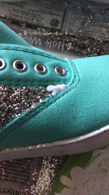 Frote simplemente mezcla un poco en los espacios en blanco (Recuerde no hacer grueso) luego espolvorear purpurina sobre el espacio (tal vez algunos del brillo que está probablemente en su periódico).