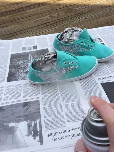 Deje sus zapatos secar otra vez. Rocíe otra capa sobre el brillo de las secciones de le gustaría. Si lo hace, deje sus zapatos secar otra vez.