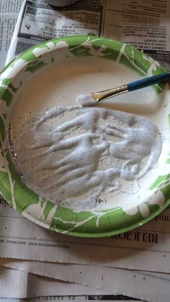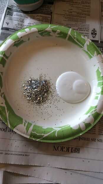 En la placa de papel, vierta la mitad modge podge y brillo medio. No queremos que la mezcla consigue demasiado grueso. Usted verá cómo puede añadir más brillo a los zapatos en un paso posterior!)