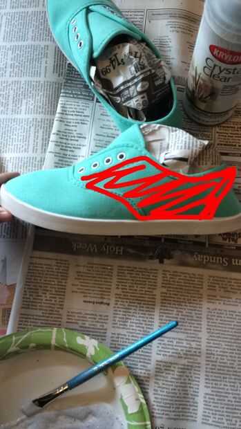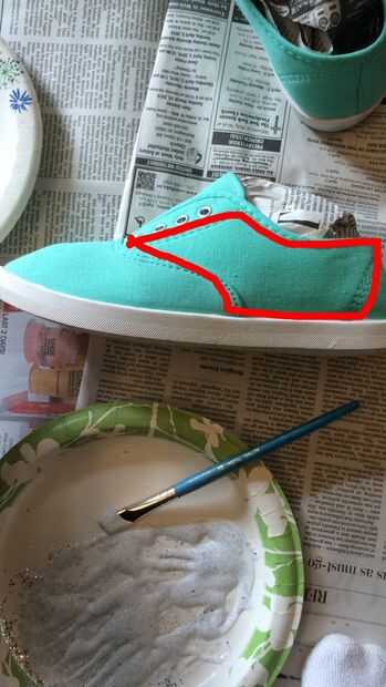 La siguiente foto es de una zona de sombra roja en los zapatos. Esto es donde estamos pintando los zapatos con la mezcla de glitter/modge podge.