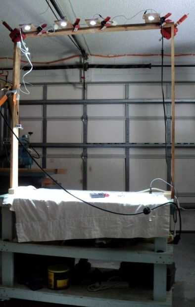 Construí un pórtico de iluminación que la altura sobre la encimera-48"(1220 m m), así que me permita determinar el mejor espacio para la convergencia de luz óptimo por el montaje de las luminarias en las lengüetas de la madera contrachapada y cambiando el centro de distancias hasta que me sentí cómodo con el resultado, que resultó para ser 18" (457mm). Dejo la matriz quemar durante la noche al monitor el calor ninguno y estado de corriente estable.