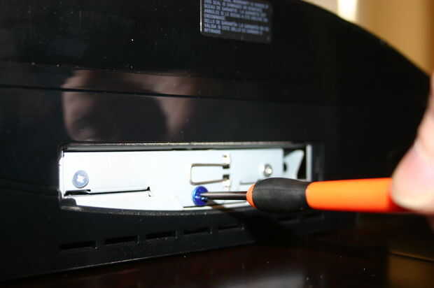 Ahora vuelve tu atención al brillante, azul tornillo en el medio. Poco es lo que está sosteniendo la bandeja de disco duro en su lugar. Cuidadosamente ese tornillo y colocarlos en lugar seguro.