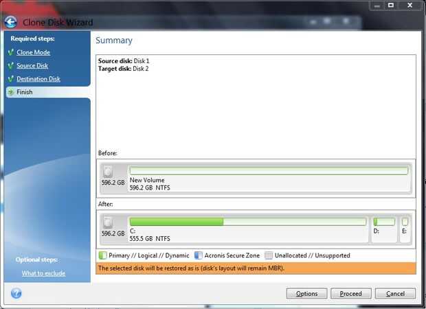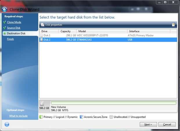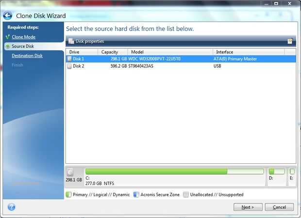 6. Seleccione la unidad vieja (será la capacidad más pequeña de las dos) como el disco de origen.
