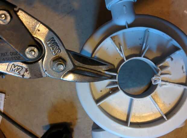 b. cortar las costillas y elementos de fijación al ras con el anillo externo en la parte inferior de la carcasa del filtro.