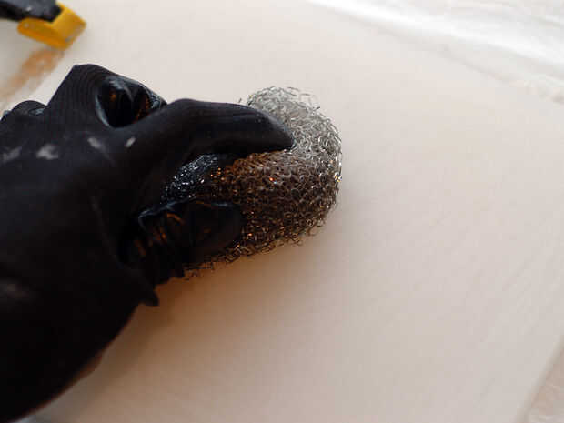 Para ayudar a acelerar el proceso, periódicamente Limpie la superficie con la lana de acero/lavador para quitar cualquier fresas y el polvo que ha mejorado la lijadora. A diferencia de la madera, polietileno tiende a estáticamente se adhiere a sí mismo que hace más difícil el proceso de lijado. Una toallita frecuentes ayudarán el proceso.