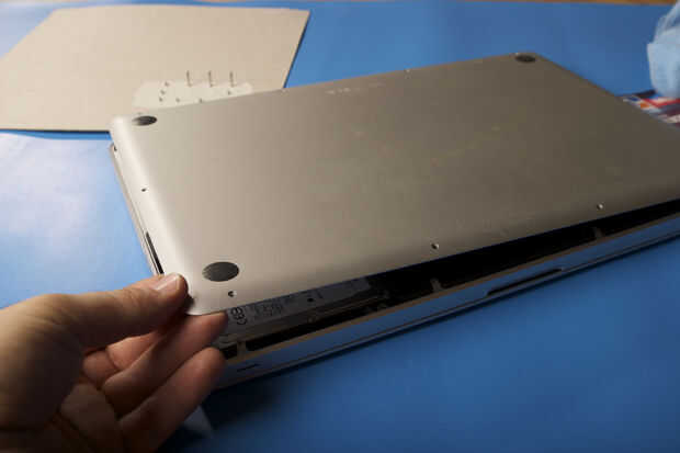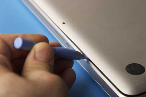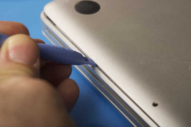 Una vez que haya terminado con todos lo tornillos consigue la herramienta de curiosos y pegarlo en el espacio entre la tapa y el cuerpo de la computadora. Lentamente y con cuidado su forma alrededor del perímetro de trabajo levante una esquina y coger con las manos. Tapa debe salir sin excesivo esfuerzo. Si se siente como aplicación de fuerza, luego parar y comprobar todo.