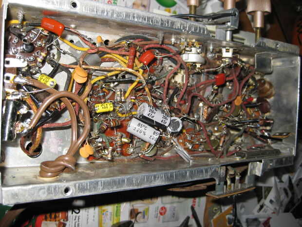 Sólo paraban de moverse un condensador en un momento mi forma de trabajo a través de cada sección y luego terminó en el otro lado de la radio en am / fm tapas de circuito. También hay algunos choques de RF y transformadores aquí, sería una buena idea ohm éstos hacia fuera con un multi medidor para asegurarse de que no tienen una conexión abierta en alguna parte. Compruebe que los cables, como se puede ver en la imagen son el tipo de tejido cubierto que podría cortas contra el chasis si se frota un agujero en él. mina extrae grandes y el material sigue siendo muy fuerte.
