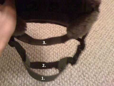 -Desenganche la correa de la barbilla y deslícelo a través de los lazos, asegúrese de que podemos tener el lado derecho frente a la barbilla