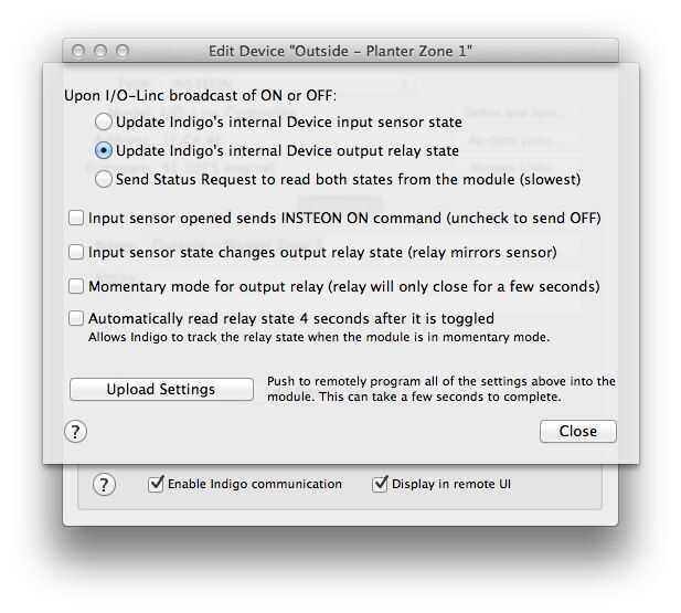 Haga doble clic en el dispositivo en la lista de dispositivos y haga clic en el Editar configuración del dispositivo... botón. No importa cuánto Sabe usted sobre el Linc de la entrada-salida, estos ajustes todavía pueden ser confusos. Coincidan con los valores con los de la captura de pantalla incluida y haga clic en el botón subir. Se configurará el Linc de la entrada-salida para cerrar el relé cuando envíe un comando y permanecerá cerrada hasta que le digas que apague. Algunas personas prefieren usar un modo momentáneo donde el relé se abrirá automáticamente después de un período determinado, sé que estará creando múltiples horarios que no se agua siempre para la misma duración.