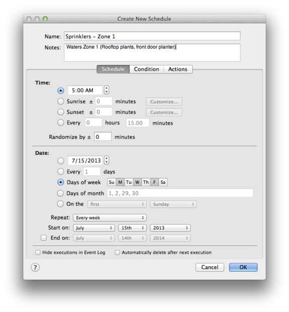 Repita el proceso para cada zona. A diferencia de los temporizadores de riego simple, fácilmente puede tener agua de zonas múltiples en diferentes momentos, incluyen un sensor de lluvia para evitar exceso de riego, etc.. Esto es sólo un punto de partida.
