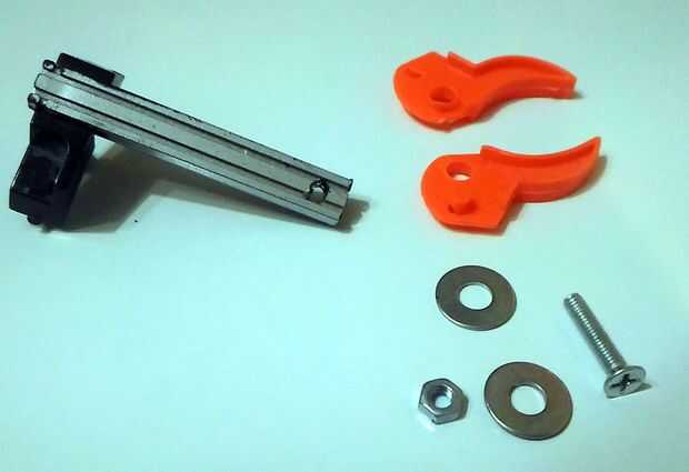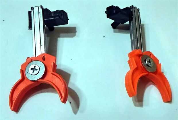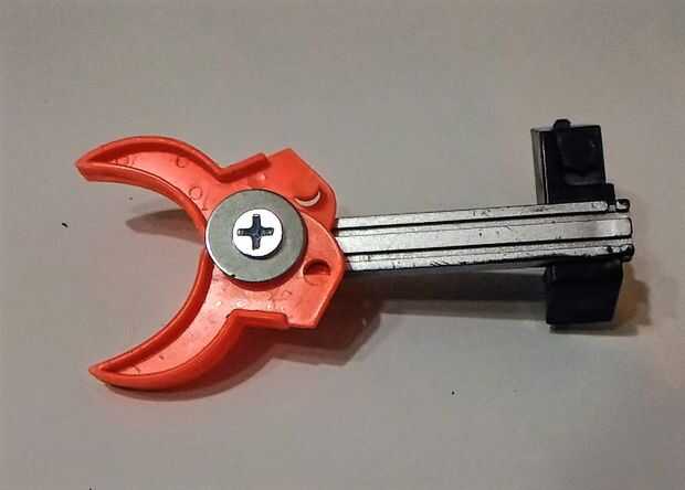 Encontré dos trozos de plástico de un R/C coche, y se ven muy convenientes para los brazos, así que les perforó y adjunta los disparadores usando los pernos y tornillos, para que se vean como alicates.
