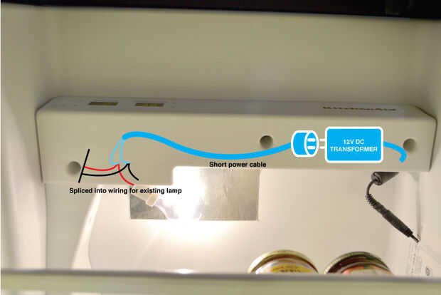 Si sin embargo, va a cablear en la potencia de las lámparas existentes como lo hice, referencia a la imagen donde he ilustrado lo que está bajo la cubierta de plástico. Con la nevera desenchufada (seguridad primero!), me cortar los dos cables a la lámpara existente y agregado los cables desde el cable de alimentación corto que tengo mi transformador enchufado. La polaridad no es un problema de este lado del transformador. Esto es muy simple cableadoy será familiar para cualquiera que ha sustituido un interruptor de pared o luz de lámpara. Usé tuercas para cables para conectar todo junto, y zip pequeños lazos para que nada nunca funciona la forma suelta. Mientras que el cableado es aún accesible, conecte el refrigerador nuevo para probar. Todo de la iluminación debe ser funcional ahora.
