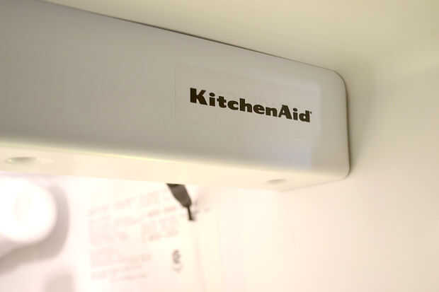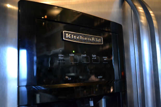 Nuestro refrigerador anterior era una marca KitchenAid, junto con el resto de los aparatos. Cuando murió, fue reemplazado con un Frigidaire, una marca respetable y que he venido a gustar mejor. En cualquier caso, quité la insignia de la insignia del metal que fue pegada a nuestra KitchenAid muerto y cubrió el simple logo de Frigidaire en el dispensador de la puerta. El otro logotipo fue al refrigerador, donde imprimí una térmica de etiquetas para pegar sobre él. Actualización instantánea! Ahora incluso el aparato reparación para la gama pensada era una KitchenAid, una marca mucho más costosa. Tonta, sí, pero ¿por qué no?