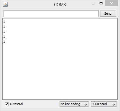 Con el Arduino sigue conectado a la computadora, abra al monitor de serie en el software de Arduino. Pres el pulsador varias veces. Cada pulsación debe producir un "1" en la ventana de monitor serie. Si es el caso, estás listo para pasar. Si no, volver atrás y compruebe que usted había conectado todo correctamente y tratar de volver a subir el sketch de Arduino. Si eso no funciona, deja un comentario abajo y voy a ver si te puedo ayudar que a funcionar.