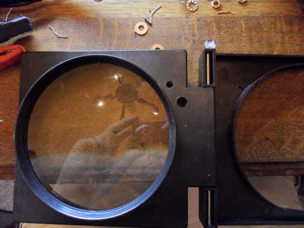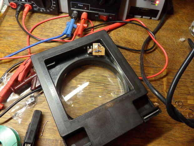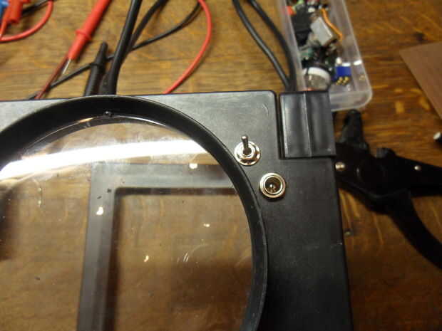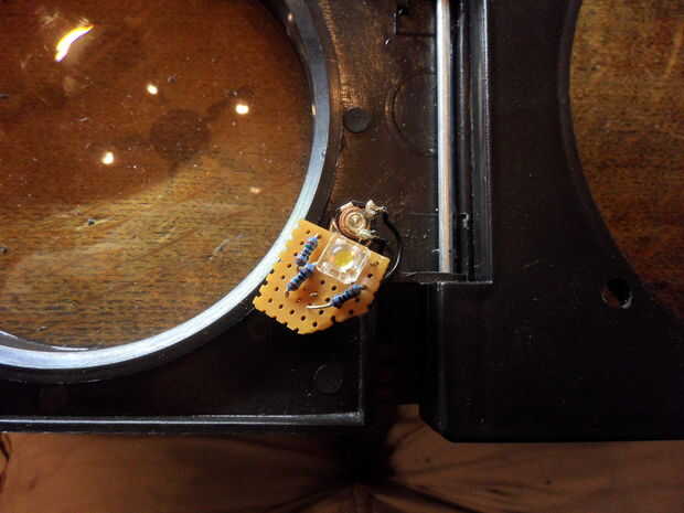 Para montar el LED, perforé 2 agujeros en el magnfier: uno para el interruptor (con el LED) y una más grande para el powerconnector. Todo equipado y atornilla y recortado para que la lupa podría doblar hacia adentro y hacia afuera fácilmente.