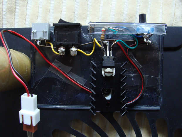 Luché un poco en esta etapa porque no podía encontrar un buen caso a utilizar para este propósito. Al final, he conseguido salir con un viejo caso de cassette de audio y que resultó para ser mejor entonces que esperaba. Yo sólo utiliza la parte superior de la caja, hizo unos agujeros de una y luego pega los componentes que. Yo no pegue el LM317 o el disipador de calor. En cambio, me adjunta una pequeña placa de aluminio en la parte posterior del disipador de calor y atornilladas en el agujero donde estaba el ventilador original. Al final, pegué el caso entero en el plato.