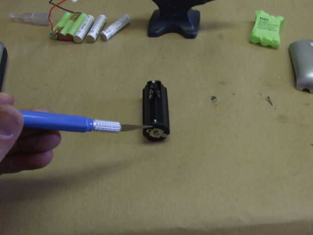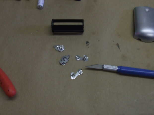 Usted tendrá que desmontar uno de estos portadores de usted pueden utilizar piezas de cualquier aparato electrónico que utiliza pilas AAA. En este caso, el metal se lleva a cabo sobre el portador por fundido pequeños pedacitos de plástico. Esto se puede cortar con un cuchillo afilado para quitar el plástico. Las piezas de metal se deslizarán justo en el soporte de plástico. Específicamente necesitará los resortes y pedacitos de metal.