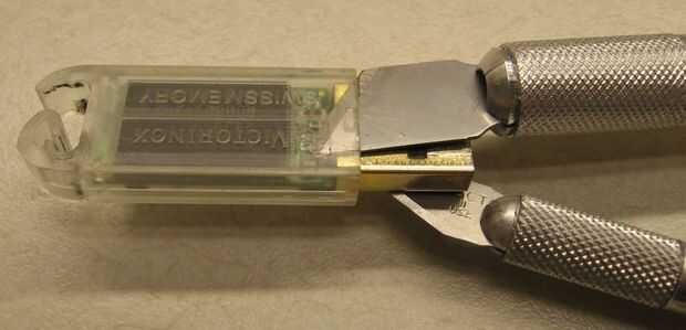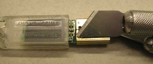 Pop la memory stick de la cuchilla. El PCB (circuito impreso) se lleva a cabo en el caso con dos lengüetas que asienten en los orificios del conector USB. Utilizando dos cuchillos Xacto, abrir el centro de la caja donde se encuentra la pequeña pestaña en el conector USB. Con cuidado deslice hacia fuera la placa manteniendo la parte superior e inferior del conector.