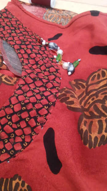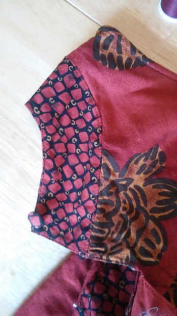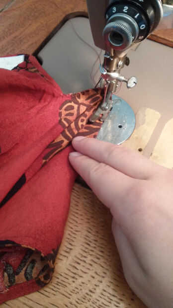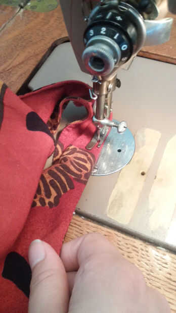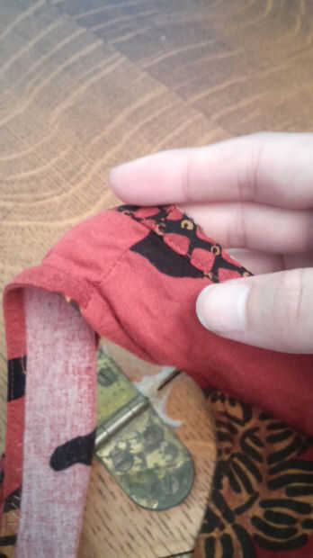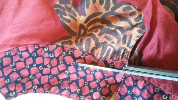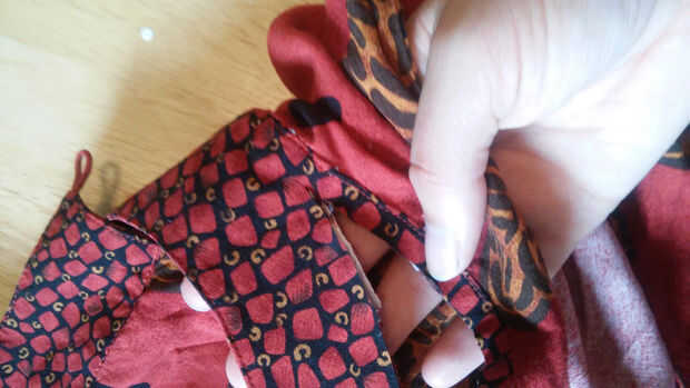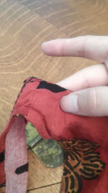 Cuando corté dejé aproximadamente 1/4" más de lo que quería el escote final ser. Luego dobla a la tela en el interior y dobladillo del cuello dando como resultado que el tamaño perfecto