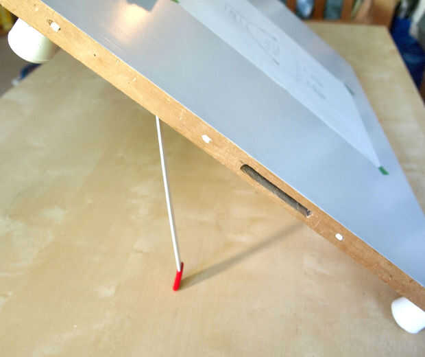 Desafortunadamente la Junta estaba en bastante mal estado, había pintura, surcos y algunos goo no identificado en la superficie. Así que limpié la superficie, cubrió con papel blanco armario, atado de piernas para que pudiera sentarse en un ángulo y añade una bandeja ajustable lápiz.
