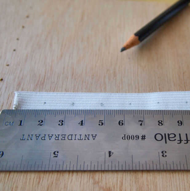 Hice cuatro elásticos para el conjunto de plumas y palillos de la mancha. Usé el mismo espacio (aparte de los agujeros y marcas aparte de 15mm en el elástico de 11mm). Estos se colocaron 40mm del borde y 50mm de los agujeros para el conjunto de lápiz.
