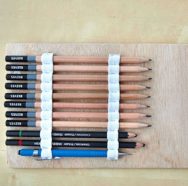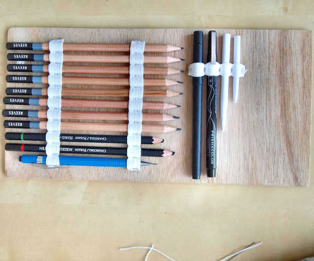 He añadido cuatro elásticos adicionales para los borradores, sacapuntas y lápiz plomos y un lugar para poner una regla pequeña en la parte posterior de la bandeja.