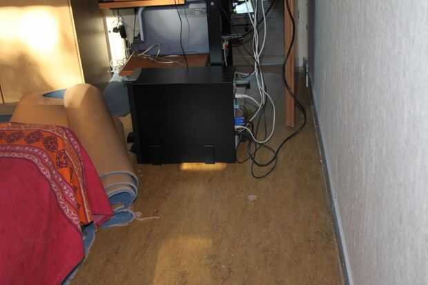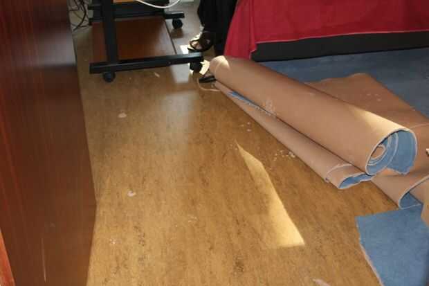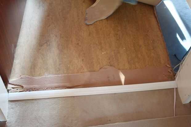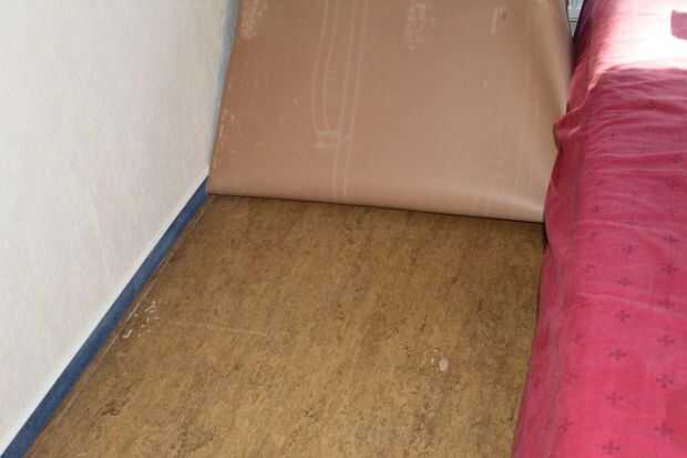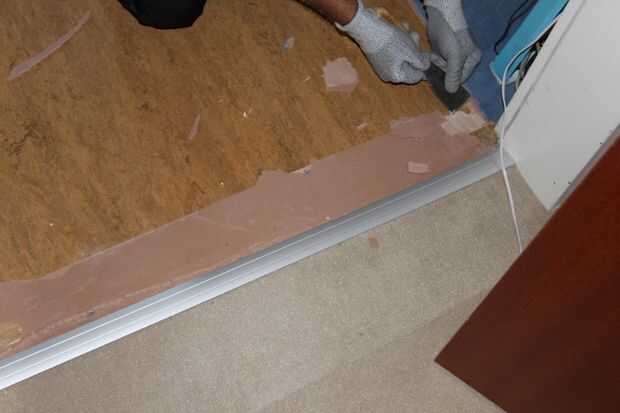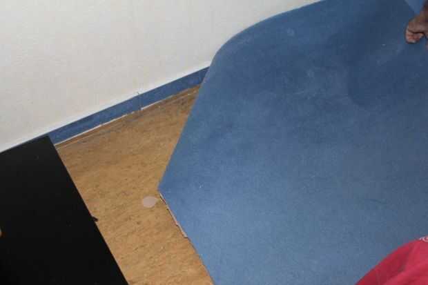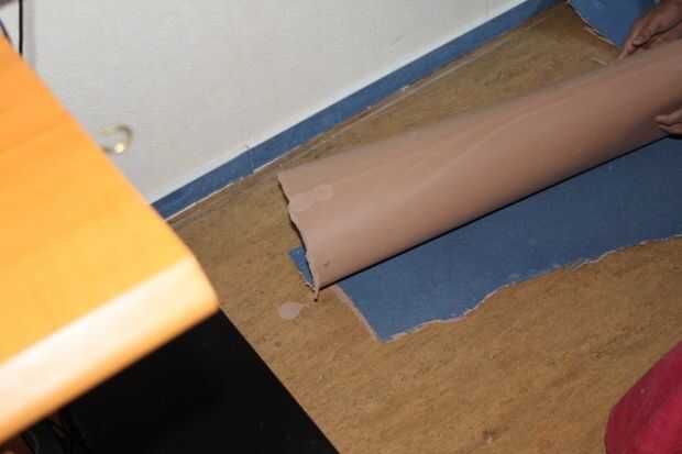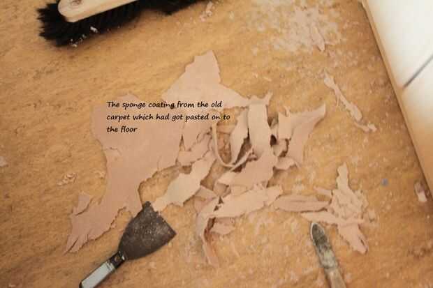 Quitar la alfombra vieja no era tan fácil como pensábamos, porque en algunos lugares la capa de la esponja debajo de la alfombra había consiguió pegada en el piso. Con un raspador tuvimos raspar lejos. Luego usamos aguarrás para limpiar el piso.