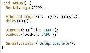 La función de configuración inicia el shield Ethernet y establece el modo de pines para los botones. Por último, le notifica sobre la serie que la configuración es completa.