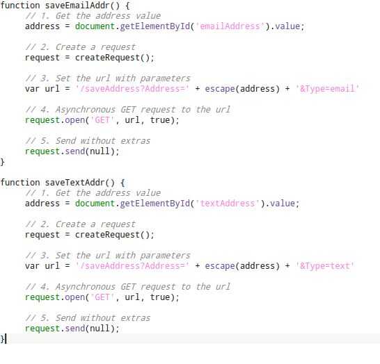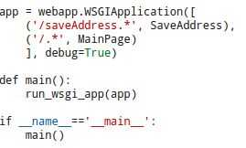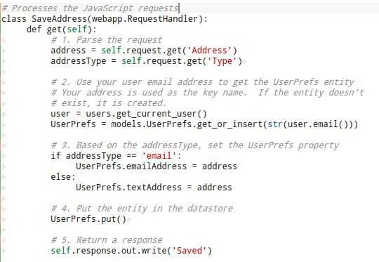 El controlador de solicitudes para tramitar las solicitudes de JavaScript es la segunda clase en main.py - SaveAddress, Fig 3. Después de analizar la solicitud de la dirección y el tipo de dirección, se utiliza la API de los usuarios para obtener su dirección de correo electrónico. Dirección de correo electrónico se utiliza como el nombre de clave en obtener la entidad UserPrefs. Si la entidad no existe, se crea una nueva con el nombre de clave. Dependiendo del tipo de dirección de envió, la dirección de correo electrónico o textAddress es modificar/insertar. Por último, la entidad se coloca en el almacén de datos y una respuesta hecha.