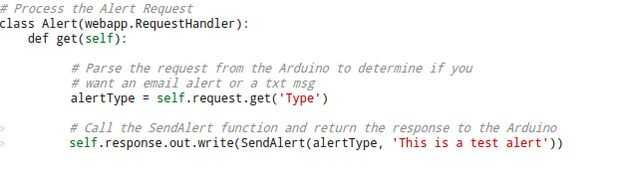 La Fig 2 muestra el controlador de solicitudes para las peticiones de Arduino. El Arduino va a pedir un tipo de alerta y se llamará la SendAlert, pasando el tipo alerty y un mensaje. La parte agradable de pasar en es SendAlert función permanece genérico y puede ser reutilizada para otras funciones (si expande la aplicación).