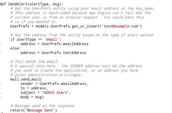 La función SendAlert se ve en la Fig 3 y requiere algunas notas especiales. En primer lugar, App Engine no puede decir quién eres cuando el Arduino hace su petición, por lo que nuestro método anterior de utilizar los usuarios API para obtener su dirección de correo electrónico y utilizar para consultar la entidad UserPrefs no funcionará aquí. Como tal, duro he codificado el correo electrónico del usuario. Usted podría pasar con la petición de Arduino, pero por brevedad, he elegido no hacerlo.
