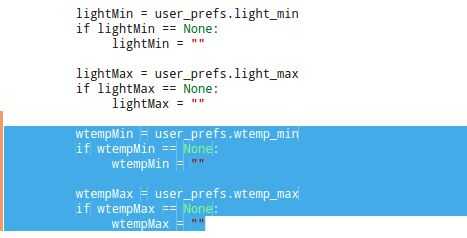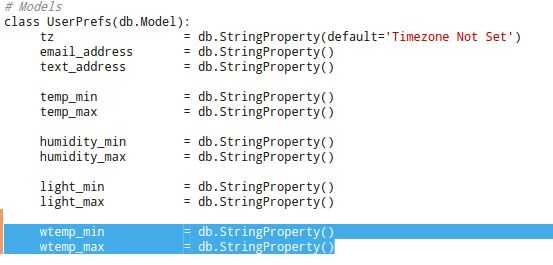 Figura 1. Abrir configuraciones.py y editar el modelo UserPrefs . Agregar en las propiedades para el mínimo de temperatura de agua y temperatura de agua máxima preferencias. Este es el primer ejemplo de la sugerencia sobre copiar y pegar los datos de propiedad de temperatura; aquí, copiar y pegar y una "w" al principio.
