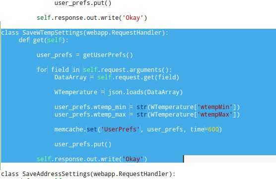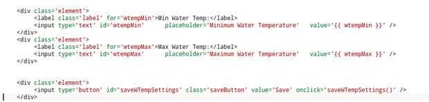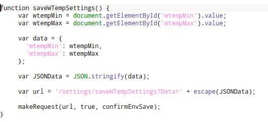 Figura 8. Para guardar las preferencias de temperatura del agua, empezar por crear el manejador onclick de javascript. Abrir settings.js, copie la función original de saveTempSettings() y editar para la temperatura del agua.