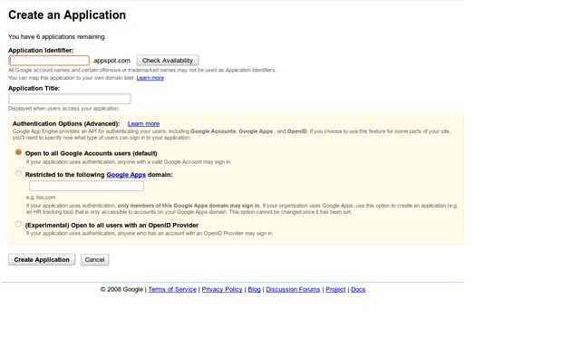 El siguiente paso es crear una nueva aplicación. Observe que la url final será yourapp.appspot.com.