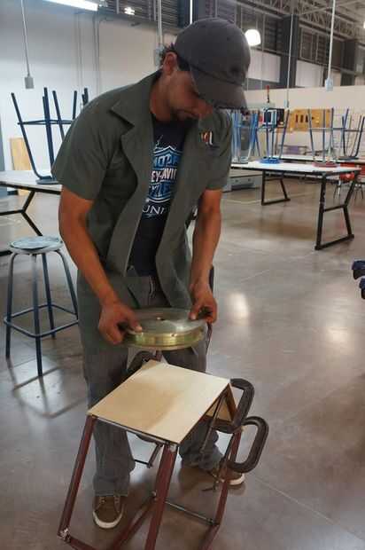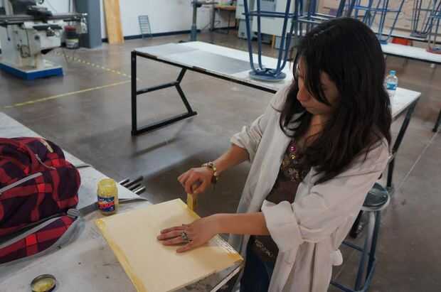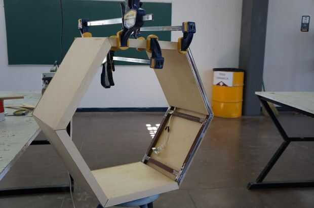 Cortaremos la media hoja de triplay en 6 rectangulos de 35 cm x 29 cm, y colocaremos pegamento de contacto en el perfil exterior de nuestra estructura y en la parte del triplay sí contacto con el perfil. Dejaremos secar por 5 minutos inmediatamente después colocaremos el rectángulo sobre la estructura, con ayuda de algunas prensas tensaremos la madera a la estructura y finalmente colocaremos una pesa.