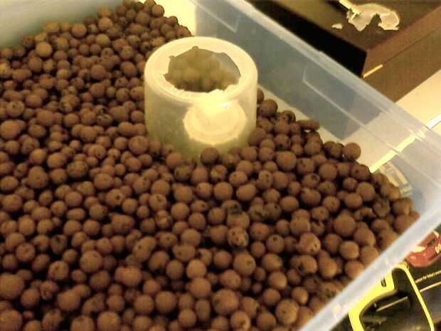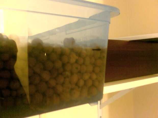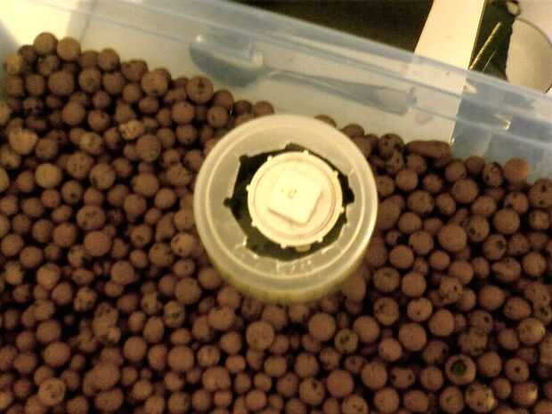 Utilice una pantalla. Mina era bastante fácil de hacer - que utiliza un recipiente alto de Deli 'llenarlo usted mismo' para aceitunas (unos 6" de alto, 5" a través de en el borde, 4" a través de la parte inferior). Perforé un montón de orificios de 1/8" como cerca del borde como sea posible, para que el agua fluya en el fondo. Corté un agujero en la parte inferior de la Copa lo suficientemente grande como para quitar la campana, en el caso de la tubería de drenaje se obstruye. Sería mucho más fácil conseguir esto en su lugar antes de llenar la cama de crecer con Hydroton. No puede ser cualquier Hydroton dentro de la pantalla, o eventualmente conseguir aspirado en la campana y obstruir el tubo vertical.