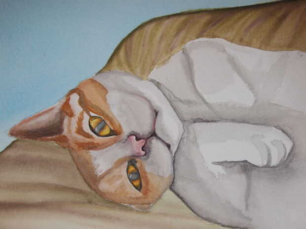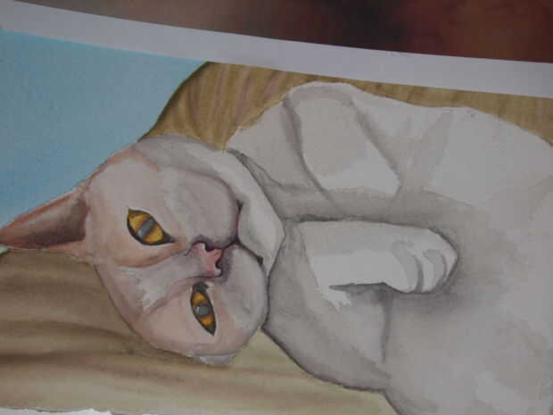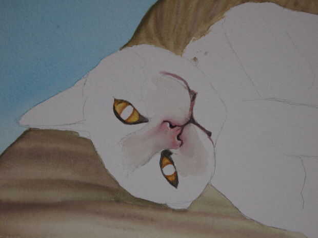 Inicialmente crear un gris lavado para ir sobre el cuerpo del gato. Entonces, fui con un lavado menos diluido de gris (un poco más oscuro) para agregar más detalles del cuerpo y alrededor de la pata. Si ves sombras en algunas zonas en tu foto, solo en pintura como lo ve. Usted puede pensar - "wow, que raro no puedo pintar eso," pero no escuche a ese lado de tu cerebro - sólo pintarlo como lo ve. Si hay grandes áreas de blanco, sólo dejan solo ya que el papel se traslucir en esas áreas y producir un brillante blanco.