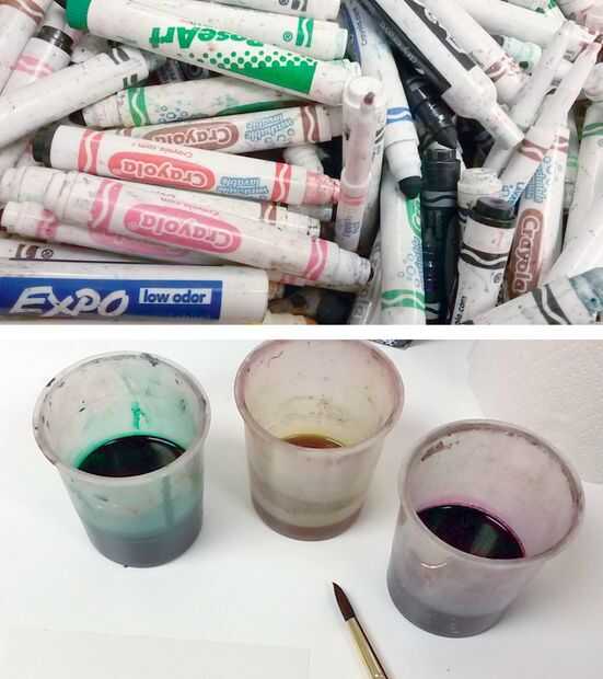 Como profesor de arte elemental, tienen una pila enorme de marcadores que mis pequeños las tapas de la izquierda y deje que seque. Cariñosamente llamamos estos marcadores icky. No me gusta tirarles, por lo que una de las cosas que hago con ellos es hacer acuarelas líquidas.